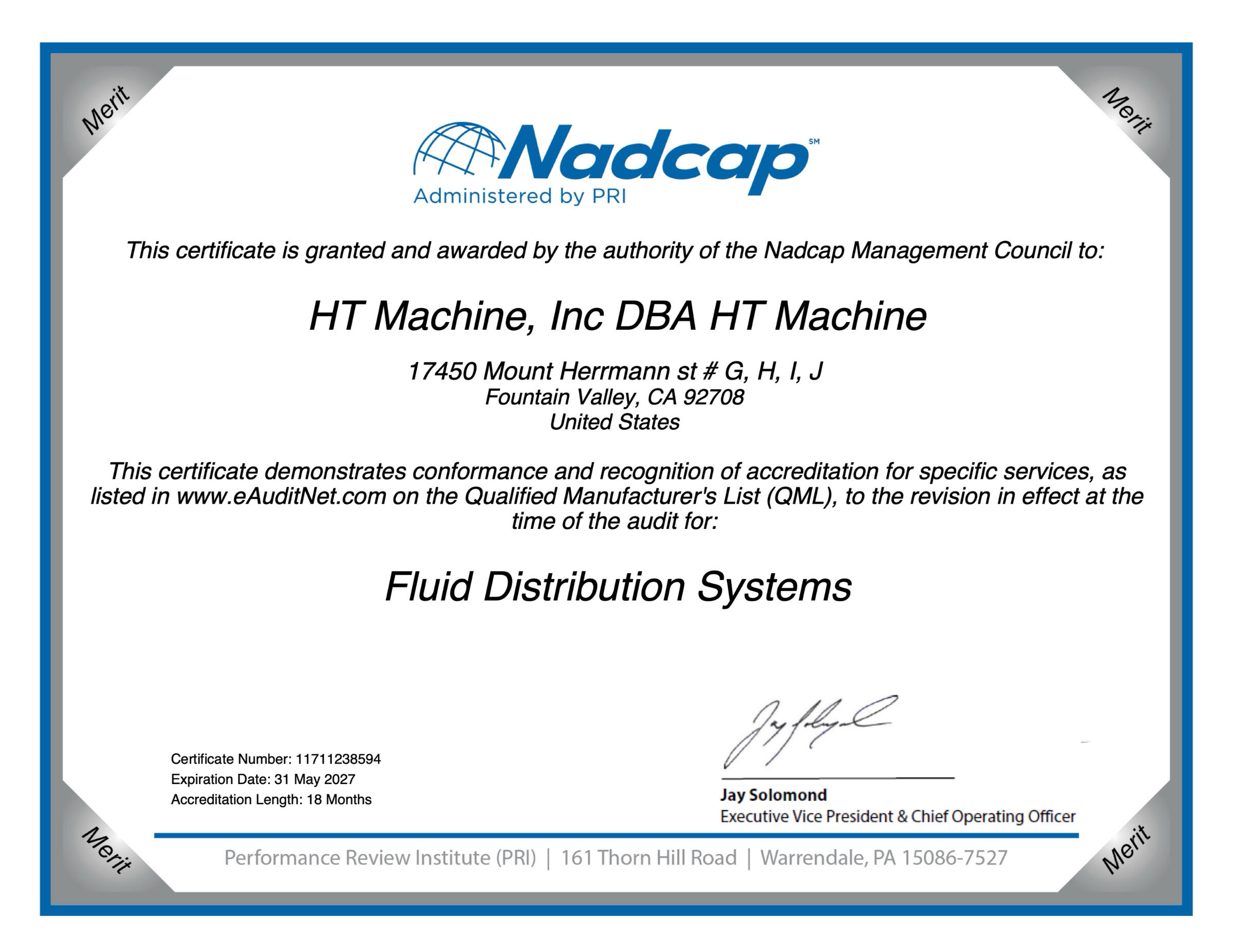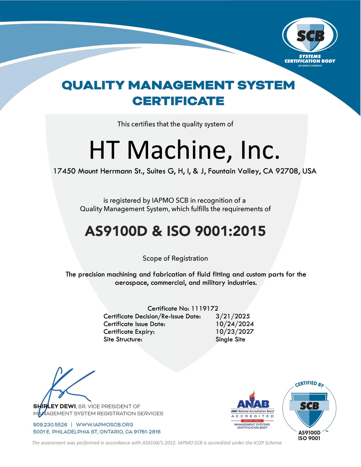 HT Machine, Inc. provides CNC Machinery Services in Orange County, California and produces and manufactures customized hydraulic, ring lock, and AS & MS fittings.HT Machine is AS9100 Rev.D with ISO 9001:2015 and Nadcap Fluid Fitting Systems certified.